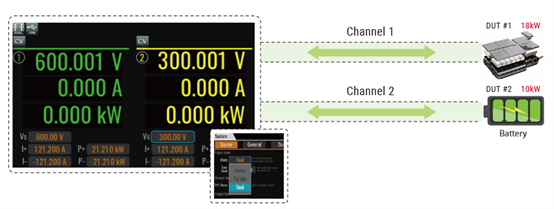 A 3U height single unit of IT6600C bidirectionalDC power supply can output 21kW each in dual channels. Each channel has acompletely independent isolation design and can be controlled and measured. TheIT6600C has both source and load function. The channel 1 (Ch1) can providepower output, and the channel 2 (Ch2) can be used as a load. It can truly beused as two units. The two channels can also be connected in series or parallelto increase the output range and cope with various test requirements.