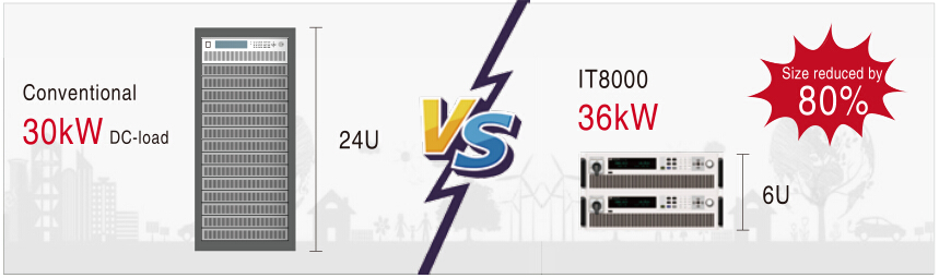 Conventional electronic loads are not only with high energy consumption, but also with very large size and weight. Energy consumption electronic load with 30KW load is at least 24U, it is difficult to transport and the cost is higher. IT8000 series regenerative DC electronic load adopts high power density design of 18kW in only 3U high. Compared to conventional electronic loads, the size for IT8000 series is decreased by 80% under the same output power.
