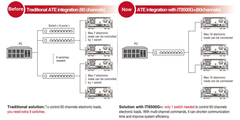 The multi-channel mode of IT8500G+ is specially designed for optimizing system integration. Through this mode, it can easily build hardwareplatforms with dozens or even hundreds of channels. It simplifies communication connections. There is no need to purchase expensive communication modules or communication interface expansion cards (such as USB hub, multi-serial card or switch), which greatly saves test costs. Themulti-channel mode of IT8500G+ allows up to 16 units connections. This means that only one communication line is required to connect to the PC forevery 16 electronic loads. Let us take the 60-channel burn-in test as an example, if you use the multi-channel mode of IT8500G+, it can save thecost of 8 expansion switches, which presents you an more efficient ATE solution.
