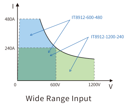 IT8900A/E series has ultra-wide voltage and current input range, covering a variety of existing models, meeting the requirements of high current, low voltage or high voltage, low current.