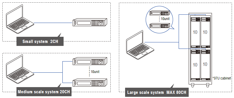 The IT-M3100D dual-channel DC power supply adopts an independent multi-channel design, which makes it easy to connect between the power supply and the computer. When a multi-channel power supply system is formed, the channel number will be displayed on the interface of each power supply. If the communication interface of one of the units is connected to the computer, you can independently control each power supply in the system by software. Each channel can be operated independently. A 37U cabinet can include up to 40 units/80 channels, which greatly increases the utilization rate of the equipment.