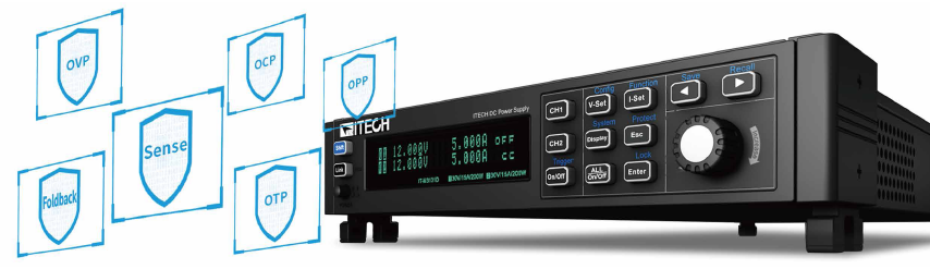 IT-M3100D dual-channel DC power supply has various protection functions such as OCP / OVP / OTP / OPP / U-Max/U-Min/Sense/Foldback. The Sense function helps to pop up a warning in time and switch the power supply to the Local output when the output terminal fails. The Foldback function is used to turn off the output when the power CV / CC is switched, so as to protect DUT that are sensitive to voltage overshoot and current overshoot.