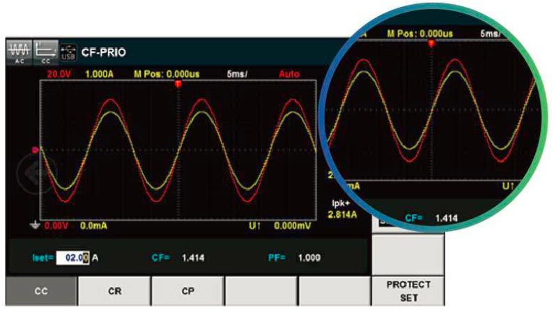 IT8600独特的示波器波形显示功能,可以选择显示或隐藏待测物的输入电压和电流波形,屏幕上只观察必要波形,更为直观。同时还可以通过人性化的截屏功能键,将当前屏幕图片截图并通过前置USB接口保存到外围设备存储盘中,方便对数据及波形进行二次分析。