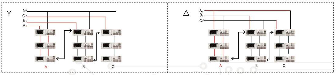 IT8600提供多台并联、三相与并联三相的功能,可以实现对于三相交流电源或者更大功率电源的测试应用。在三相并联应用中,用户可以根据实际需求实现Y型和Δ型的连接方式,进行自由灵活的搭配。IT8600还可以实现交流380V的输入,全球通用,满足多元的测试需求。