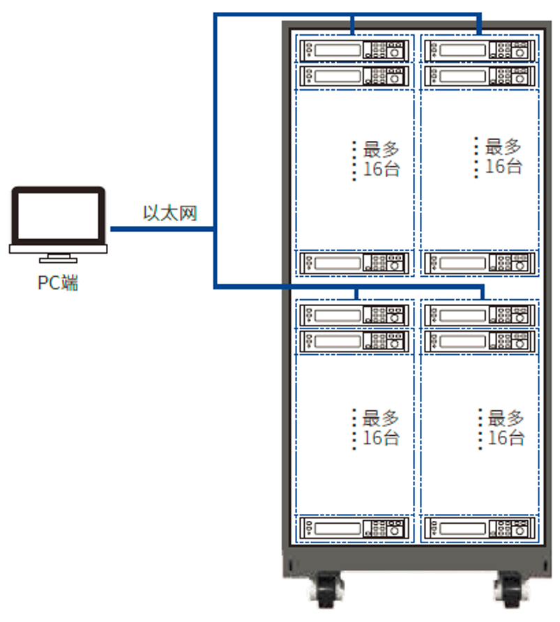 IT-M3100系列具备独立多通道的设计架构, 16台IT-M3100组成多通道电源系统后,每台仪器界面会显示通道号。将其中一台电源的通讯接口与PC 端连接,可在上位机软件中独立控制系统中的每台电源,每个通道可完全独立操作。IT-M3100系列可达16*16通道,1个37U机柜内就可达64通道,透过并联功能可支持多种不同功率的待测物测试,并且使用户的使用更为弹性,设备的使用率大幅提高。