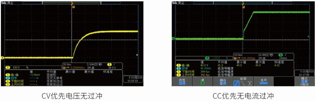允许用自行设定电源ON时的输出模式,防止电源输出ON时的过冲。选择CV优先模式,电源优先高速建立电压的同时抑制电压过冲的产生。选择CC优先模式,电源优先高速建立电流的同时抑制电流过冲的产生。