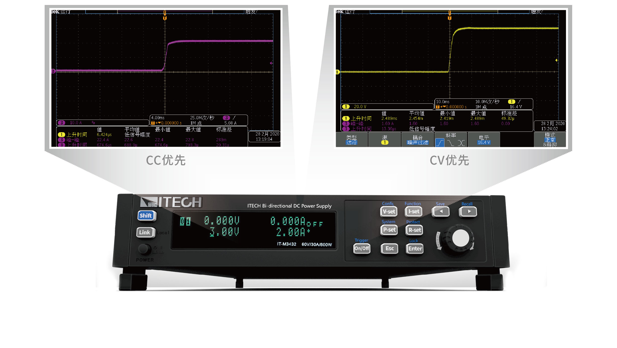 IT-M3400延续了ITECH的CC/CV优先权概念,帮助用户解决了长期测试中存在的多种严苛问题,使需求的电源高速或者无过冲的应用,变得更加灵活。针对需要电压高速的测试场景,用户可以选择CV优先模式,获取较快的电压爬升速度;也可以选择CC优先模式,输出电流无过冲,用来测试恒流工作特性的待测物。适用于诸如激光器、集成电路、充放电、和汽车电子的电源瞬变仿真和表征等多种测试应用。