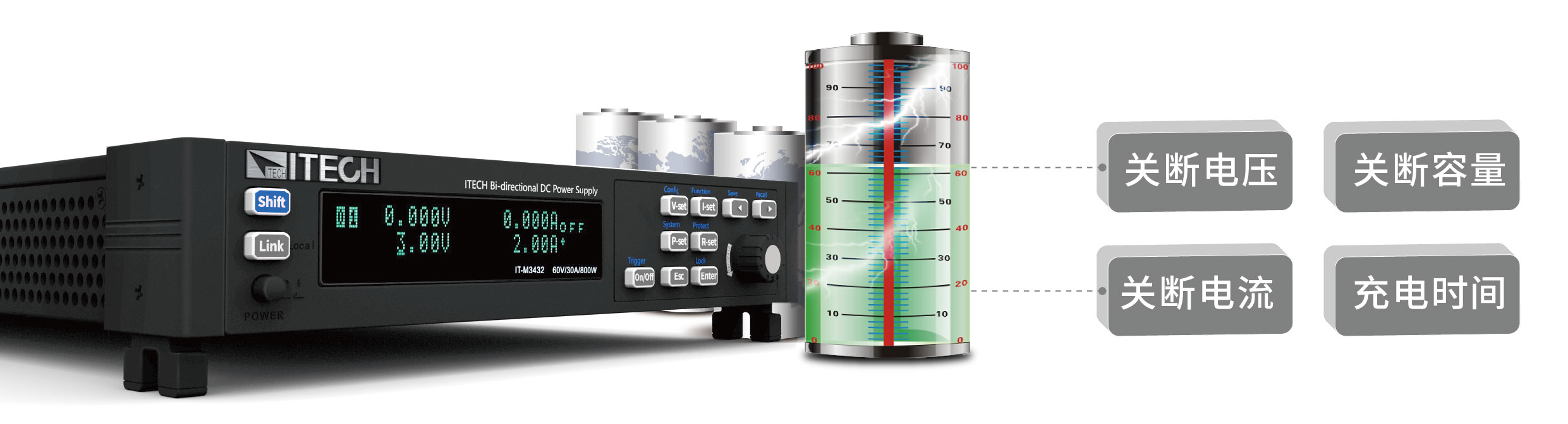 IT-M3400具有电池充电功能,可对电池进行充电测试。用户通过面板就可自行设置电池四种测试关断条件:关断电压、关断电流、关断容量和充电时间。当四者中任意一种条件满足时,即会自动中断测试。测试过程中可观测电池的电压、充电时间和已充电容量。