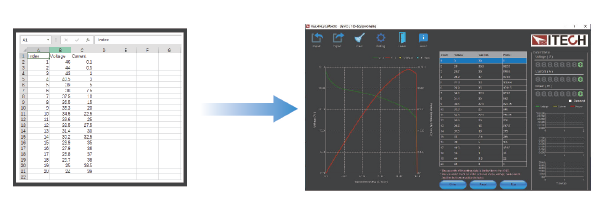 ♦ 支持.csv文件导入功能,最多可导入4096点(I-V)数据